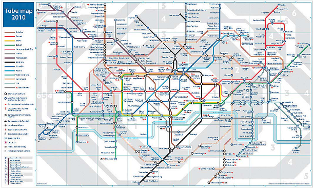 The London Underground map is based on the 1931 design by Harry Beck. The design has undergone many changes, moving from an accurately spaced to a schematic design, but the colors of the lines have changed little from Its first inception. Different colors for different lines enable passengers to trace easily the line that they need to travel on. Developed by engineer Harry Beck, it’s one of the most famous maps in city transport. Beck used color to differentiate lines, so that people could readily identify the right route. The map is schematic i.e. it’s a simplified diagram that uses abstract graphic elements (lines) to represent a complex real-world situation. This most original of designs is a model copied in various forms throughout the world, including the Paris and New York City metro systems.