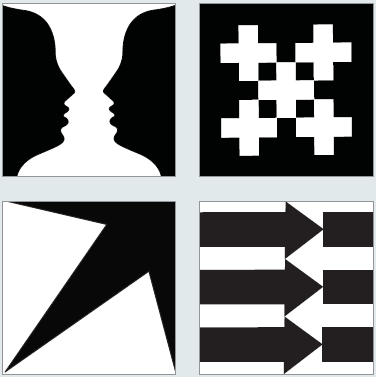 - Figure ground relationships produce different effects that confuse the eye. For example, the Rubin vase (top left) relies upon a visual confusion between figure and ground, so that the eye sees either faces or a vase.